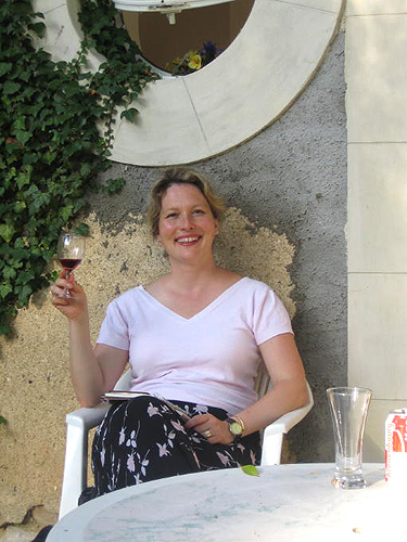 Ramona enjoying a class of wine at Le Vieux Moulin