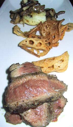Coriander-Crusted Beef, Lotus Root Chips, Sauteed Mushrooms